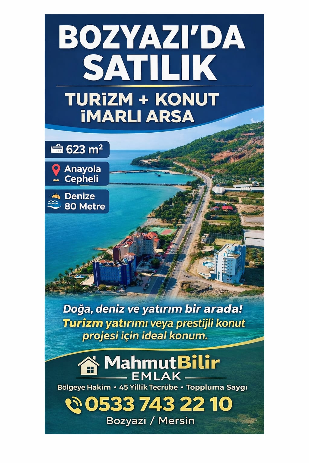 mersin bozyazı ilçesinde denize 80 metre mesafede D 400 Karayoluna sıfır konumda
